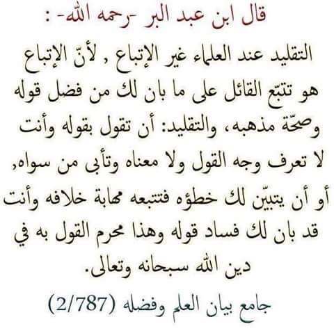 Blind following with the Ulamaa is other than (the typical) following. That is because (the typical) following is that you follow the one who made the statement on that which has become clear to you from the virtue of his statement and soundness of his Madhhab. As for blind following, it is that you speak which his speech and you don’t know the angle of the statement nor the meaning of it and you refuse (to follow/accept) other than it. Or it can be that his mistake has become clear to you but you still follow him (and/or his opinion) out of fear of opposing him. This is the case when it indeed has become clear to you the corruption of his statement. And this is prohibited for you to speak with in the religion of Allah glory be to Him the Most High.