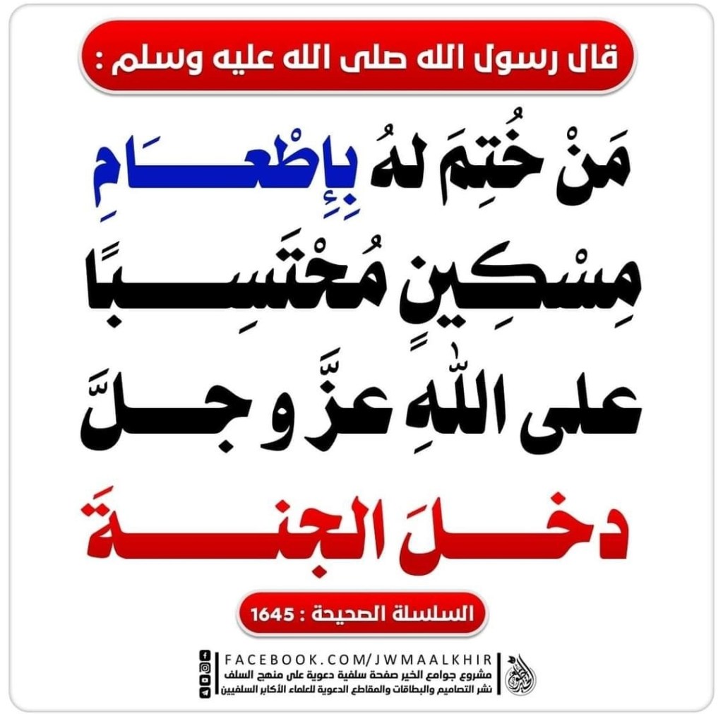 Ending One’s Life Upon Feeding The Poor The Messenger of Allāh ﷺ said: “Whoever’s life ends with the feeding of a poor person (while) seeking (the reward of) Allāh (in doing so) will enter into paradise.” [As-Silsilah As-Sahīhah #1645] Share this: Click to share on X (Opens in new window) X Click to share on Facebook (Opens in new window) Facebook Click to email a link to a friend (Opens in new window) Email Click to print (Opens in new window) Print Like Loading... Related