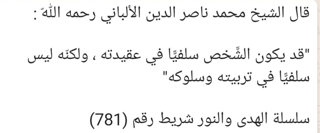 Be Salafī In Your Creed And Deeds The Noble Scholar Shaykh Muhammad Nasrud-Dīn Al-Albānī رحمه الله stated: The Noble Scholar Shaykh Muhammad Nasrud-Dīn Al-Albānī رحمه الله stated: “It’s possible that the person can be Salafī in his creed however, he’s not Salafī in his upbringing and behavior.” [Silsilah Al-Hudā wan-Nūr Recording Number (781)] Share this: Click to share on X (Opens in new window) X Click to share on Facebook (Opens in new window) Facebook Click to email a link to a friend (Opens in new window) Email Click to print (Opens in new window) Print Like Loading... Related