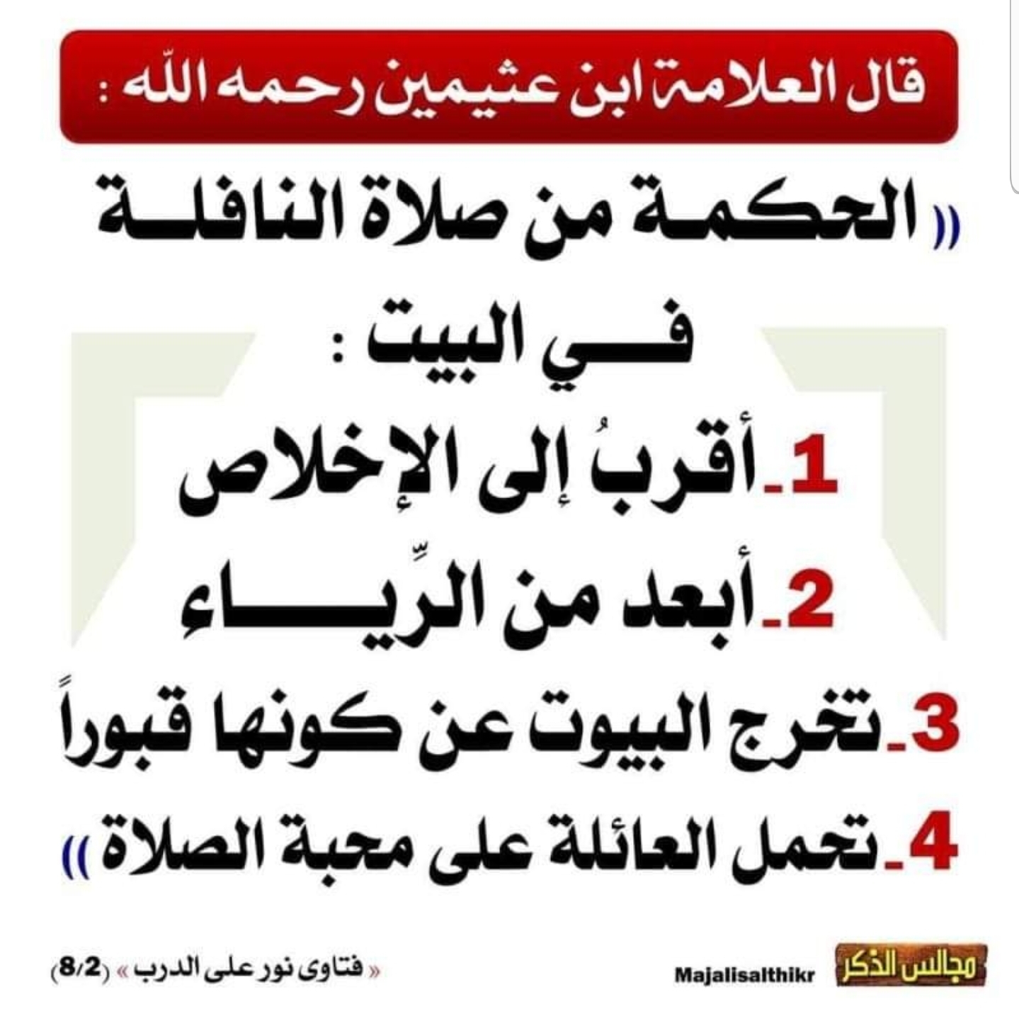 The Wisdom Behind Praying The Nāfilah In The Home Shaykh Muhammad bin Sālih Al-‘Uthaymīn رحمه الله stated : “The wisdom behind making the Nāfilah prayer in the home: ▪︎It’s closer to having Ikhlās. ▪︎Farther away from Riyā ▪︎It removes the homes from them being like graveyards. ▪︎It causes the family to love the Salāh.” [Fatāwā Nūr ‘Alā ad-Darb 2/8] Share this: Click to share on X (Opens in new window) X Click to share on Facebook (Opens in new window) Facebook Click to email a link to a friend (Opens in new window) Email Click to print (Opens in new window) Print Like Loading... Related