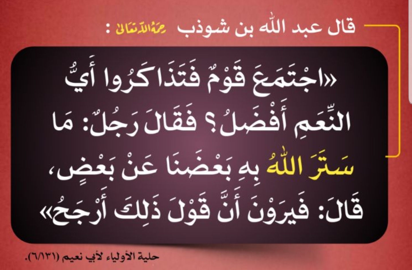 “The people gathered together and were going over which of the blessings (of Allāh) is the best? A man said: ‘That which Allāh has concealed of (our shortcomings from) each other’.” He said: “So they view that to be strongest statement.”