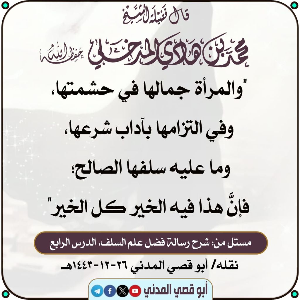 “The beauty of the woman is in her modest behavior and her holding on to the mannerisms of her (religious) legislation and that which her righteous predecessors were upon. Indeed all of the good (for her) is in this.”